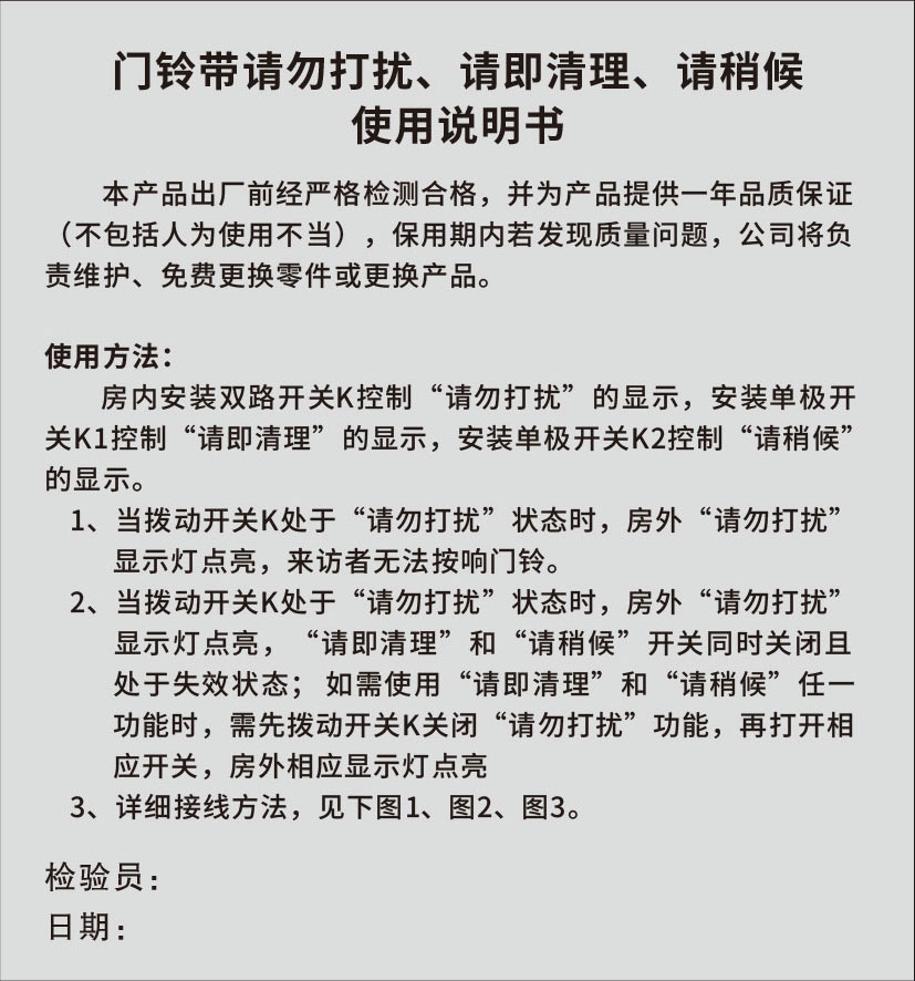 門鈴帶請勿打擾、請即清理、請稍候