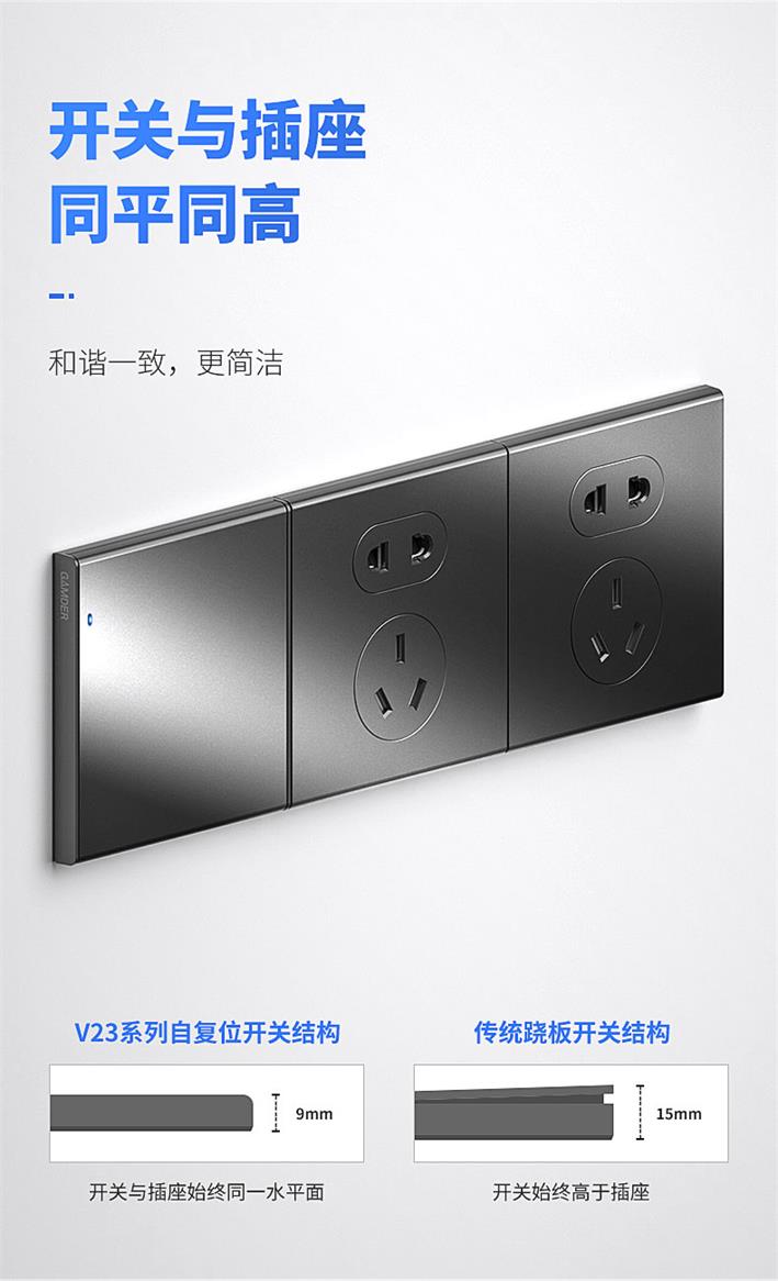 此外,V23定制系列的優(yōu)點(diǎn)還在于:純平復(fù)位,不易積塵;大間距插孔,同時(shí)使用互不干擾等。亮點(diǎn)頗多,不勝枚舉。