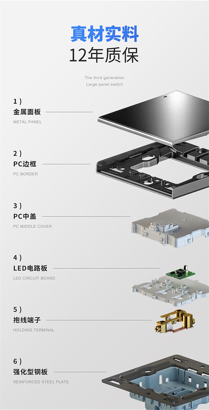 1、結(jié)構(gòu)方面。市場上的大板開關(guān),往往有十幾毫米厚,而插座厚度相對(duì)較低,這就造成了開關(guān)和插座的厚度不統(tǒng)一。第三代復(fù)位大板開關(guān)的厚度縮減到九毫米,與插座厚度一致。開關(guān)與插座在外觀上,更協(xié)調(diào)、美觀。