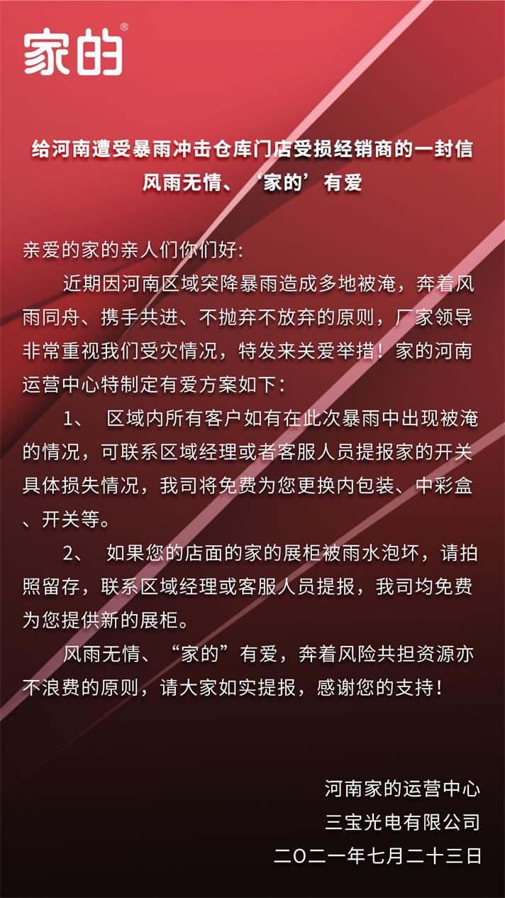 河南出現(xiàn)水災(zāi),家的區(qū)域經(jīng)理、客服人員及時聯(lián)系當?shù)亟K端客戶,了解受災(zāi)情況。廠商攜手共進,共同解決問題。針對河南當?shù)匾蛴晁荩斐蓳p失的家的終端客戶,家的公司將作出相應(yīng)的關(guān)愛措施。比如,免費更換內(nèi)包裝、中彩盒,開關(guān)等。家的為受災(zāi)的家的實體店恢復(fù)經(jīng)營提供支援,減輕受災(zāi)客戶的壓力。