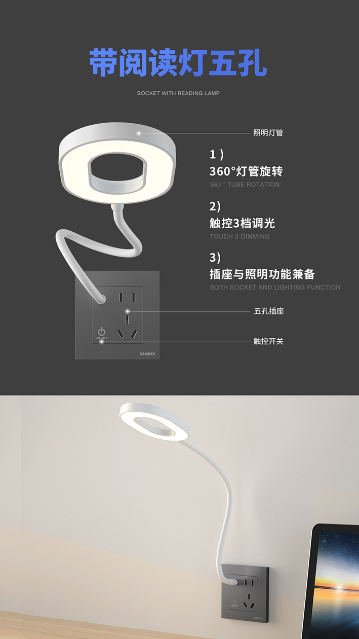 功能方面。V20系列五孔,功能得到提升。閱讀燈五孔、感應燈五孔、小夜燈五孔,實現照明與插座巧妙結合,十分人性化,給人們的生活帶來許多便利。