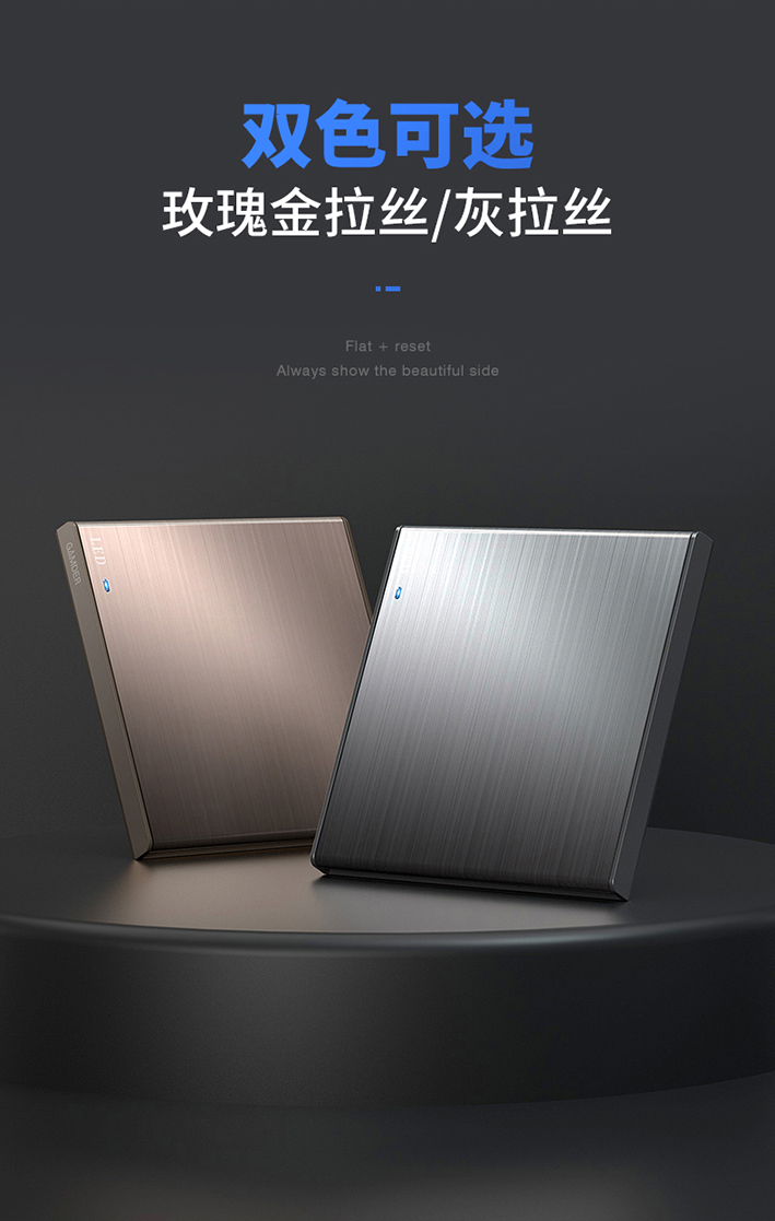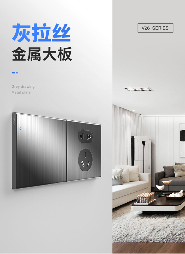 外觀方面。V26系列分有兩種顏色,玫瑰金拉絲和灰拉絲,可任意選擇。V26系列,屬于第三代純平復位大板開關。
