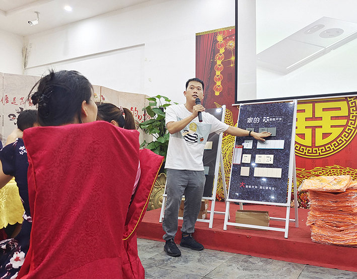 首先,由家的惠州、河源、梅州區域經理——黃堯濤發表講話。他為大家詳細地介紹家的新品——第3代復位大板開關、一體式防水插座。