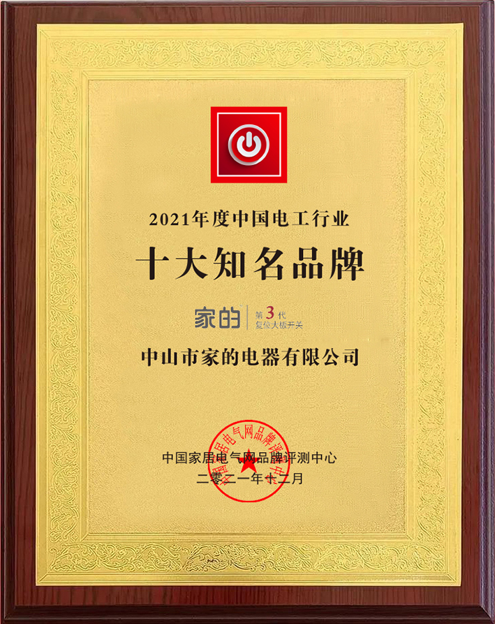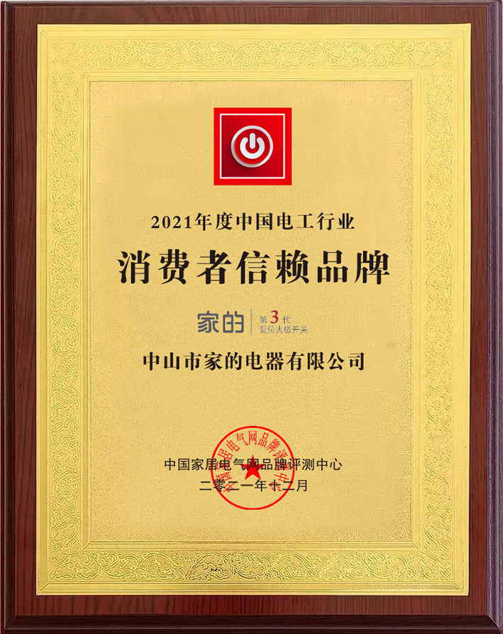 2021年12月,中國(guó)家居電氣網(wǎng)品牌評(píng)測(cè)中心、《家居電氣》雜志融媒體平臺(tái)共同舉辦了“2021中國(guó)家居電氣行業(yè)優(yōu)秀品牌評(píng)選暨2022家居電氣品牌扶持計(jì)劃”活動(dòng)。在此次活動(dòng)中,家的開(kāi)關(guān)榮獲“2021年度中國(guó)電工行業(yè)十大知名品牌”“2021年度中國(guó)電工行業(yè)消費(fèi)者信賴品牌”兩大獎(jiǎng)項(xiàng)。