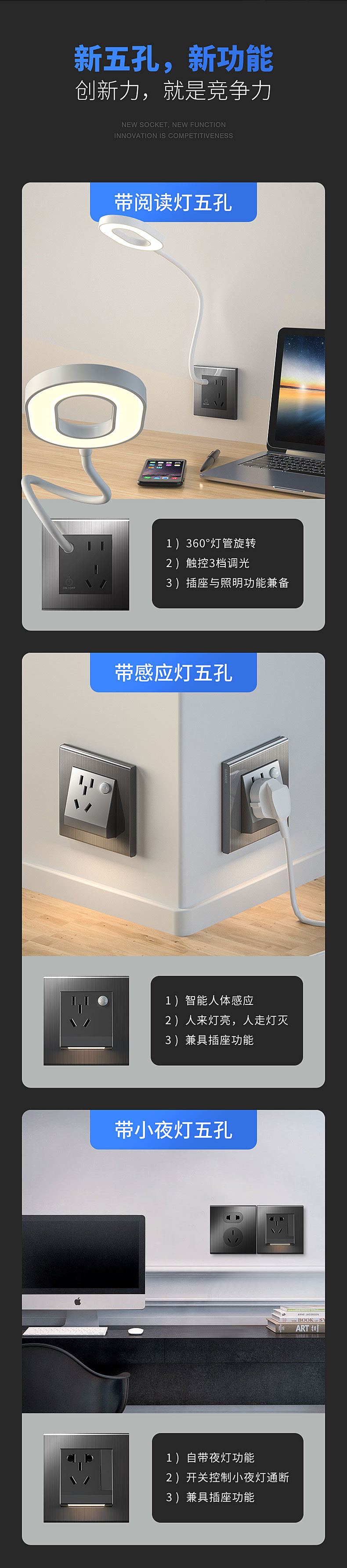帶感應燈二三極插座